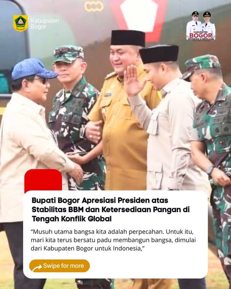 Cibinong, Jurnaliswarga.id — Bupati Bogor, Rudy Susmanto, menyampaikan apresiasi kepada Presiden Republik Indonesia, Prabowo Subianto, atas keberhasilan pemerintah pusat dalam menjaga stabilitas harga bahan bakar minyak (BBM) serta memastikan ketersediaan pangan di tengah dinamika konflik global.