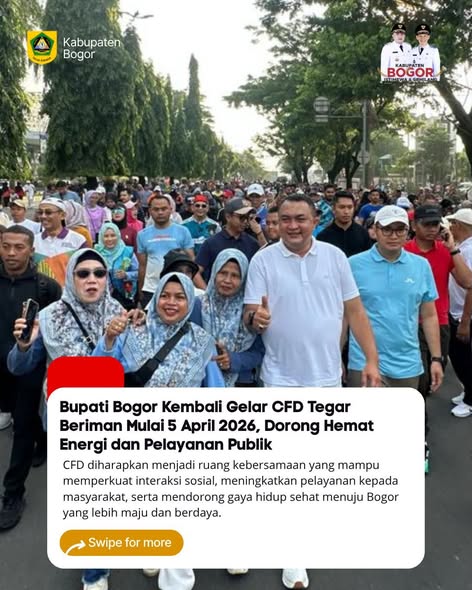 CIBINONG,JURNALISWARGA.ID — Pemerintah Kabupaten Bogor kembali menghadirkan Car Free Day (CFD) Tegar Beriman sebagai ruang publik yang sehat, produktif, dan inklusif bagi masyarakat. Kegiatan ini dilaksanakan atas arahan Bupati Bogor dan akan mulai digelar pada Minggu, 5 April 2026, pukul 06.00–10.00 WIB.