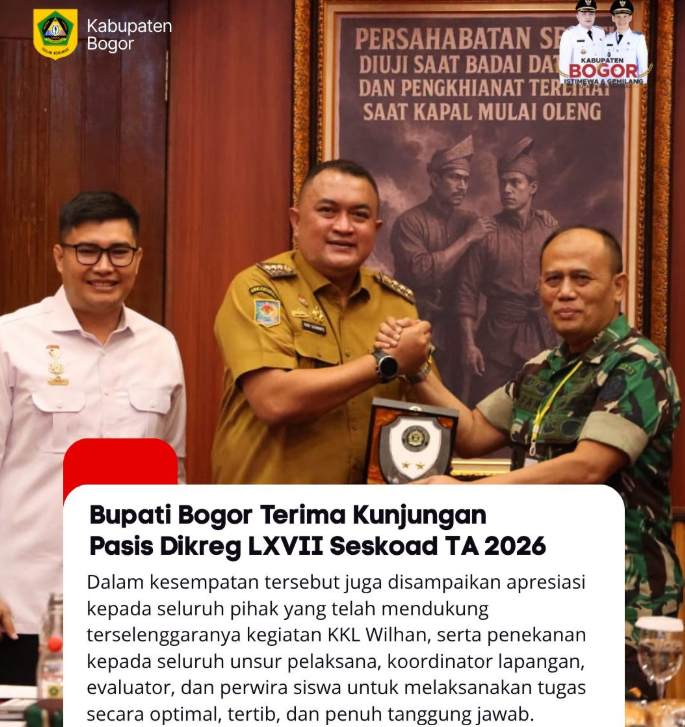Bupati Bogor Rudy Susmanto menyampaikan rasa bangga dan kehormatan atas kunjungan para perwira siswa. Ia menegaskan bahwa momentum ini menjadi bagian penting dalam memperkuat kolaborasi antara Pemerintah Daerah dengan TNI dan Polri dalam membangun Kabupaten Bogor serta menjaga stabilitas wilayah.