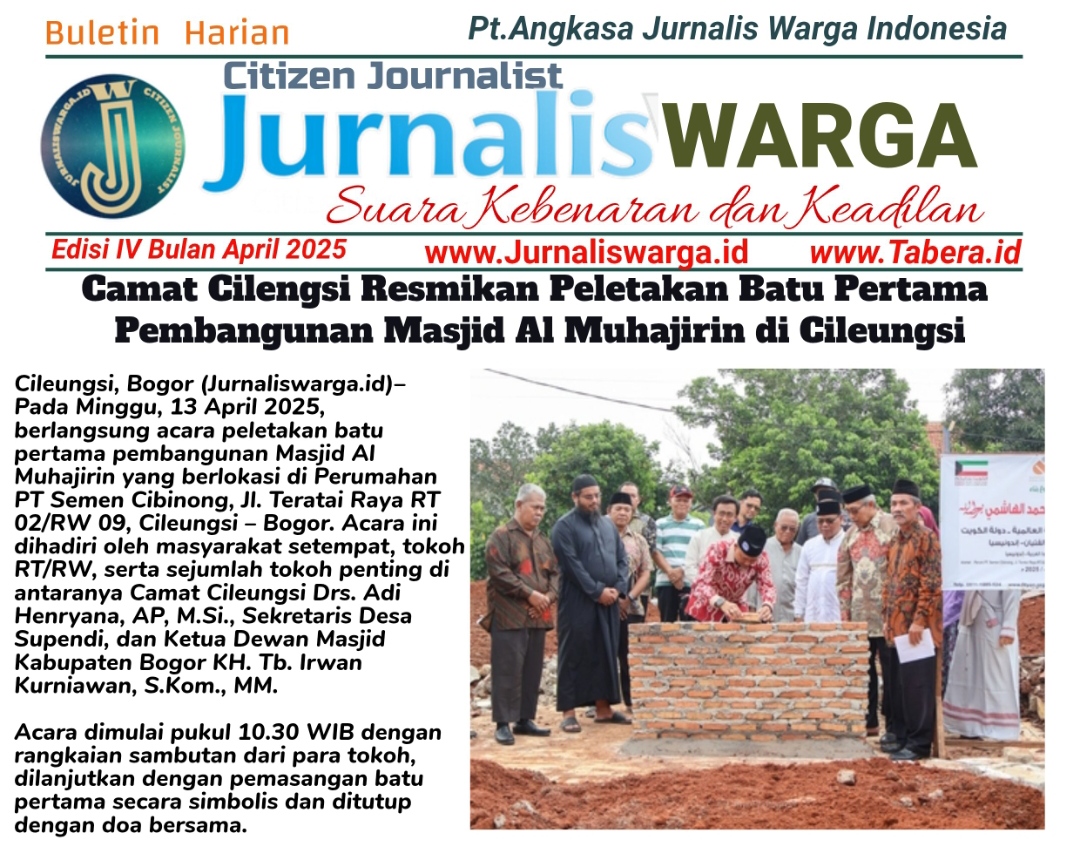 Cileungsi, Bogor (Jurnaliswarga.id) – Pada Minggu, 13 April 2025, berlangsung acara peletakan batu pertama pembangunan Masjid Al Muhajirin yang berlokasi di Perumahan PT Semen Cibinong, Jl. Teratai Raya RT 02/RW 09, Cileungsi – Bogor. Acara ini dihadiri oleh masyarakat setempat, tokoh RT/RW, serta sejumlah tokoh penting di antaranya Camat Cileungsi Drs. Adi Henryana, AP, M.Si., Sekretaris Desa Supendi, dan Ketua Dewan Masjid Kabupaten Bogor KH. Tb. Irwan Kurniawan, S.Kom., MM.