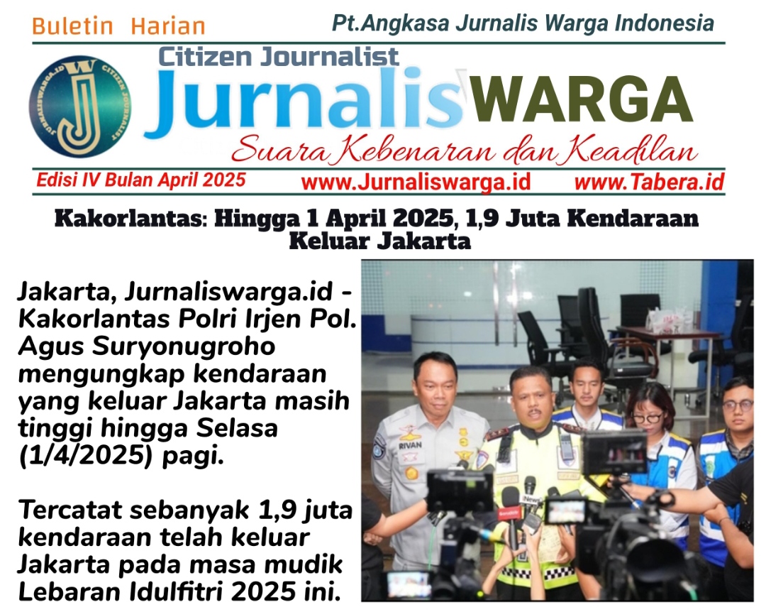 Jakarta, Jurnaliswarga.id – Kakorlantas Polri Irjen Pol. Agus Suryonugroho mengungkap kendaraan yang keluar Jakarta masih tinggi hingga Selasa (1/4/2025) pagi. Tercatat sebanyak 1,9 juta kendaraan telah keluar Jakarta pada masa mudik Lebaran Idulfitri 2025 ini.