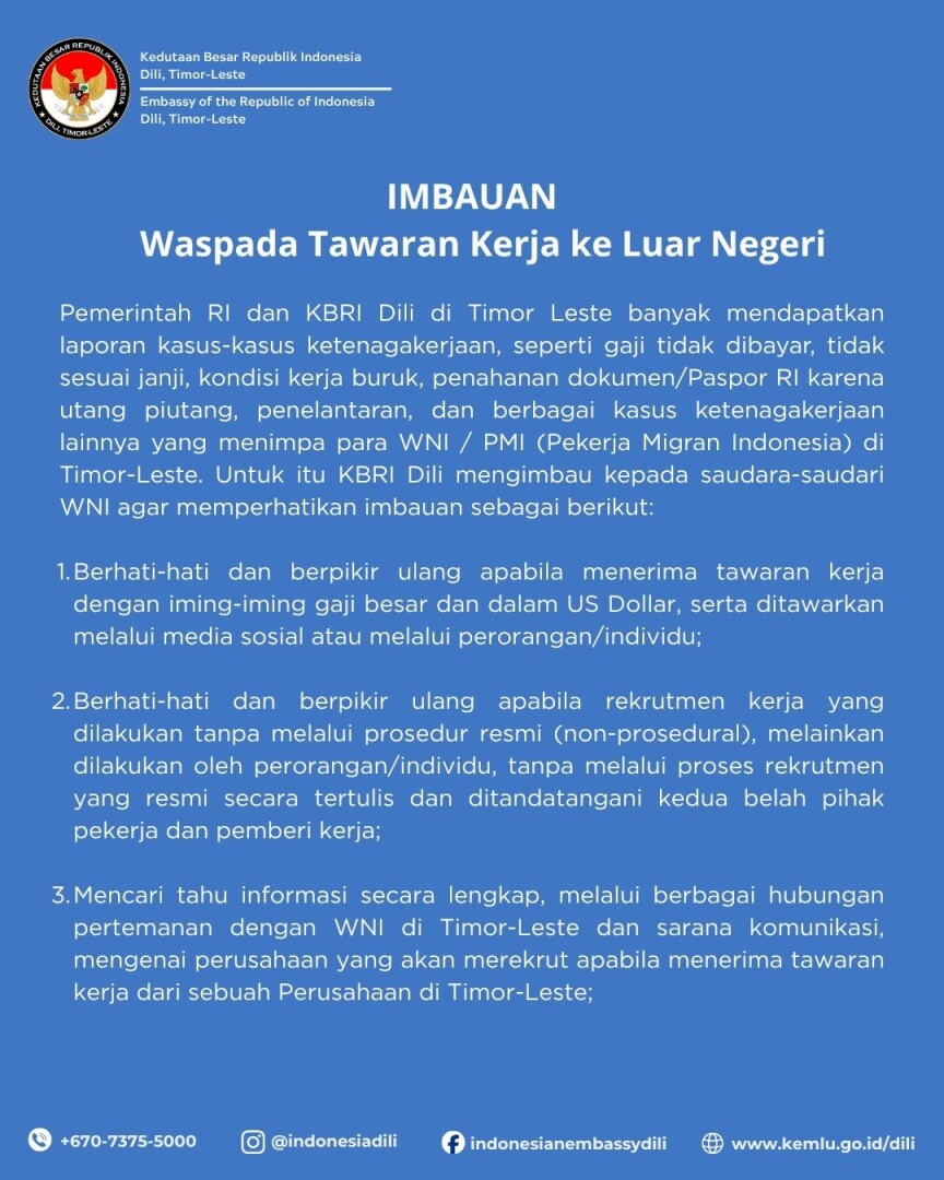 Untuk informasi lebih lanjut bisa menghubungi nomor WhatsApp Hotline KBRI Dili di 670 7375 5000.