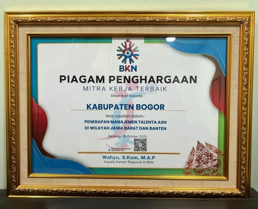 Selain itu, Kabupaten Bogor juga menerima penghargaan atas penerapan Manajemen Talenta ASN Terbaik di wilayah Jawa Barat dan Banten. Penghargaan tersebut menjadi pengakuan atas konsistensi Pemkab Bogor dalam membangun sistem pengelolaan talenta ASN berbasis merit, berorientasi pada kinerja, serta pengembangan sumber daya manusia aparatur.