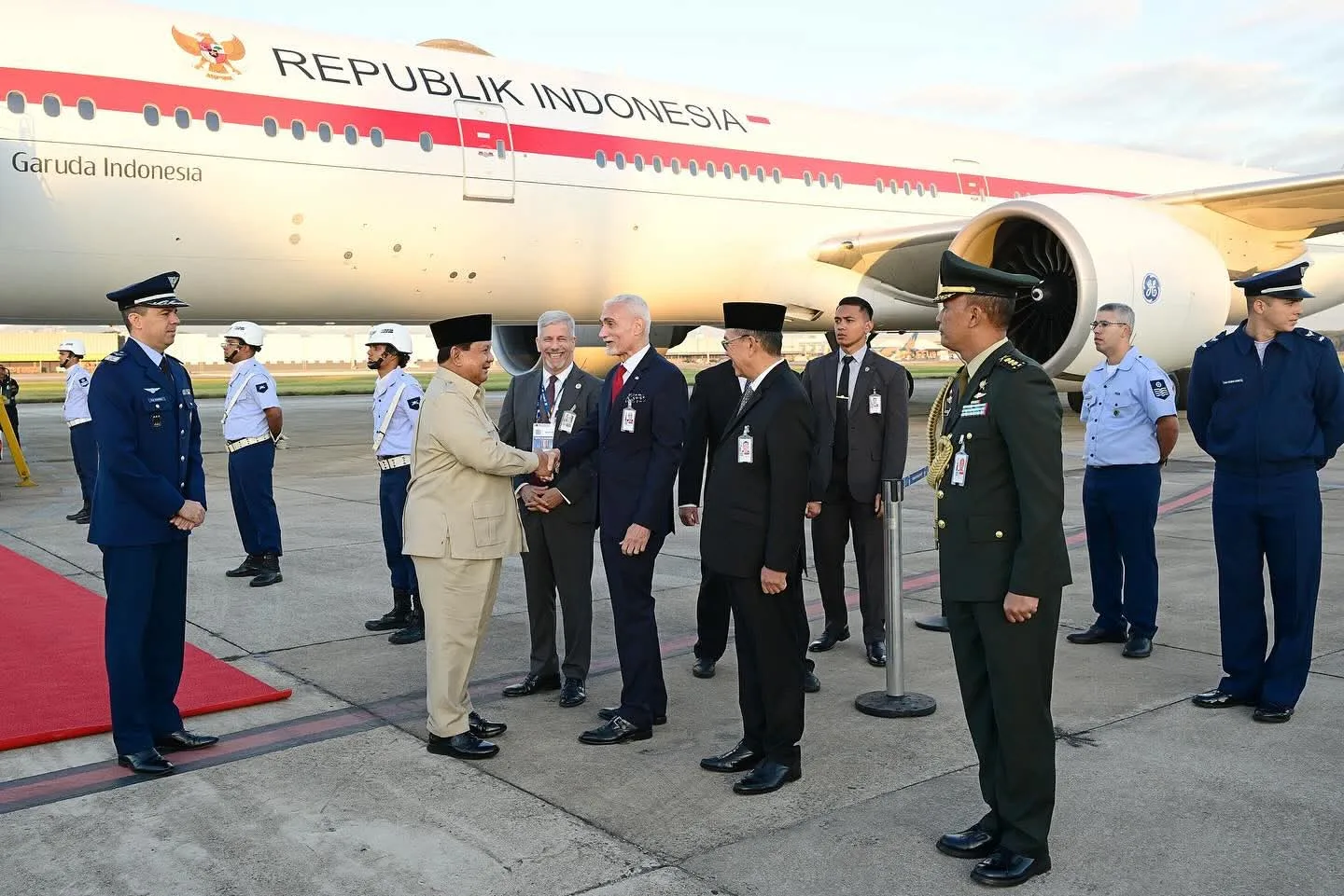 Pesawat Kepresidenan Garuda Indonesia-1 mendarat di Air Base Galeão, di mana Presiden Prabowo langsung disambut dengan upacara kehormatan militer. Hadir dalam penyambutan tersebut antara lain Sekretaris Promosi Perdagangan, Sains, Teknologi, Inovasi, dan Budaya Kementerian Luar Negeri Brasil, Dubes Laudemar Gonçalves de Aguiar Neto, Komandan Airforce Base Galeão Kolonel Marcell Barros de Paula, Duta Besar RI di Brasilia Edi Yusup, serta Atase Pertahanan KBRI Brasilia Kolonel Rizal Ashwam.