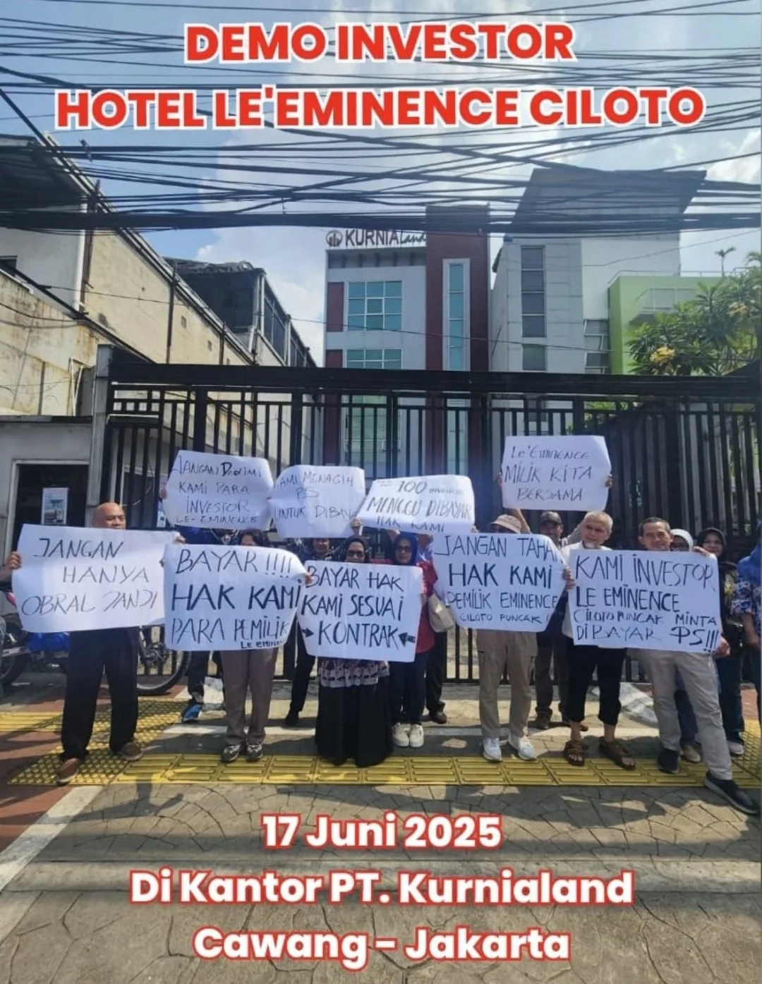 JAKARTA, JURNALISWARGA.ID – Sekitar 20 orang yang merupakan Investor pemilik Kondotel Sahid Eminence (sekarang hotel Le Eminence) melakukan aksi unjuk rasa di depan kantor Kurnia Land, yang juga merupakan kantor dari PT Eminence Hospitality Services, di Jl. Otista bilangan Jakarta Timur, Selasa (17/6/2025).
