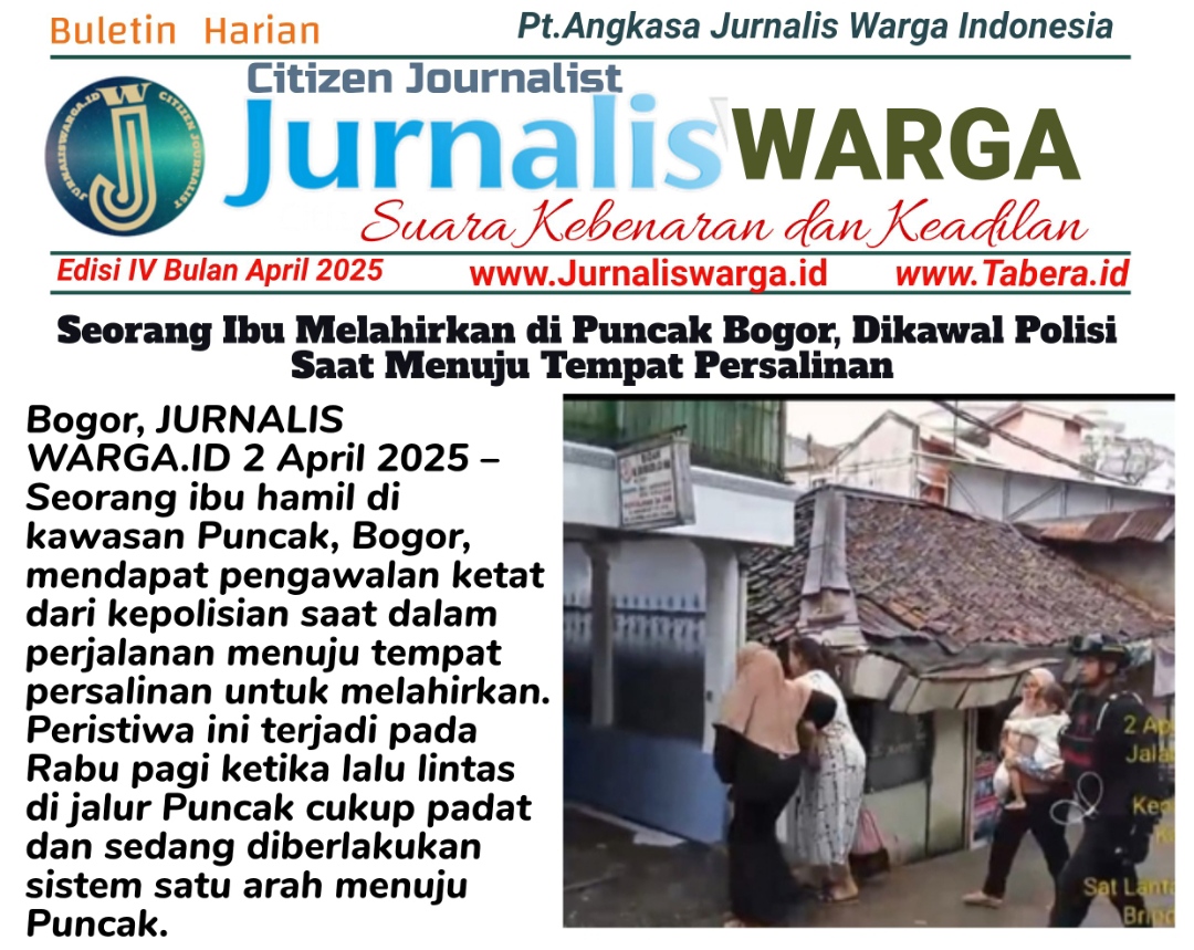 Bogor, (JURNALISWARGA.ID) 2 April 2025 – Seorang ibu hamil di kawasan Puncak, Bogor, mendapat pengawalan ketat dari kepolisian saat dalam perjalanan menuju tempat persalinan untuk melahirkan. Peristiwa ini terjadi pada Rabu pagi ketika lalu lintas di jalur Puncak cukup padat dan sedang diberlakukan sistem satu arah menuju Puncak.