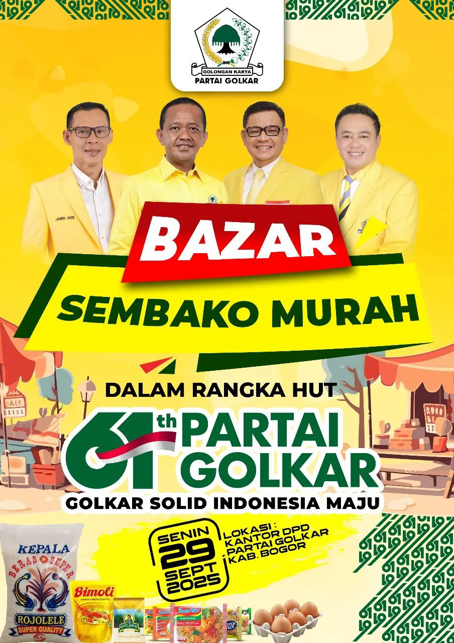 Bogor, JURNALISWARGA.ID – Dalam rangka memperingati Hari Ulang Tahun (HUT) ke-61 Partai Golkar, Dewan Pimpinan Daerah (DPD) Partai Golkar Kabupaten Bogor menggelar Bazar Sembako Murah untuk masyarakat. Acara tersebut akan berlangsung pada Senin, 29 September 2025, berlokasi di Kantor DPD Partai Golkar Kabupaten Bogor.